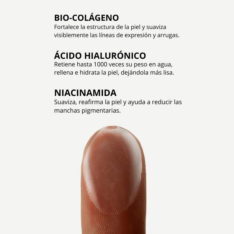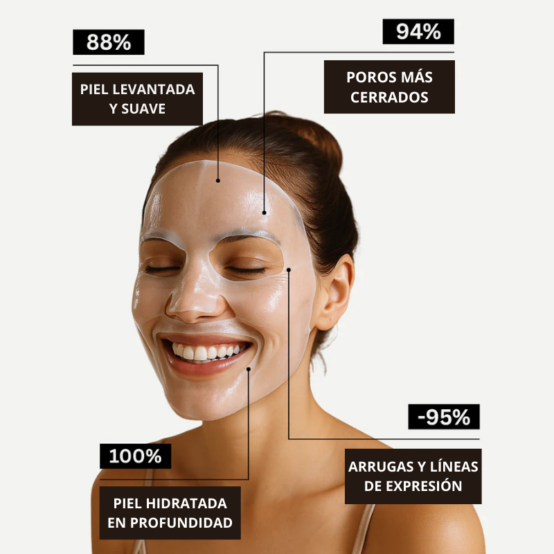 Regálale a tu piel una dosis poderosa de biocolágeno que alisa al instante arrugas y líneas de expresión. Nuestra mascarilla actúa en profundidad para repulpar, hidratar intensamente y devolver un brillo luminoso desde la primera aplicación. Su fórmula premium penetra rápido y deja la piel más firme, suave y visiblemente más joven, sin esfuerzo.